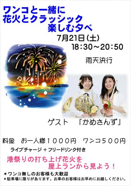 屋上で花火見物、3階でホルンとフルートの演奏があります。是非お越しください♪